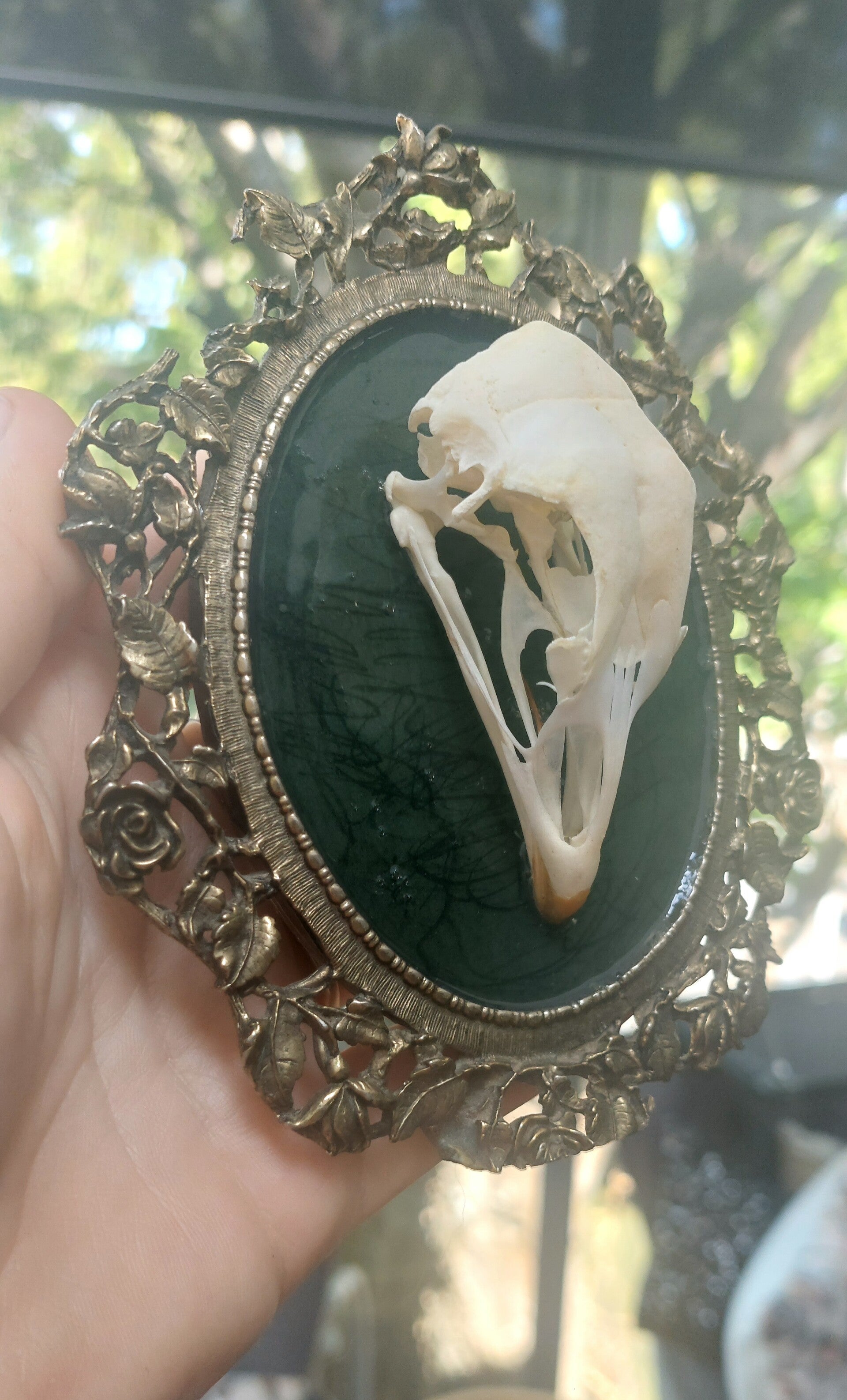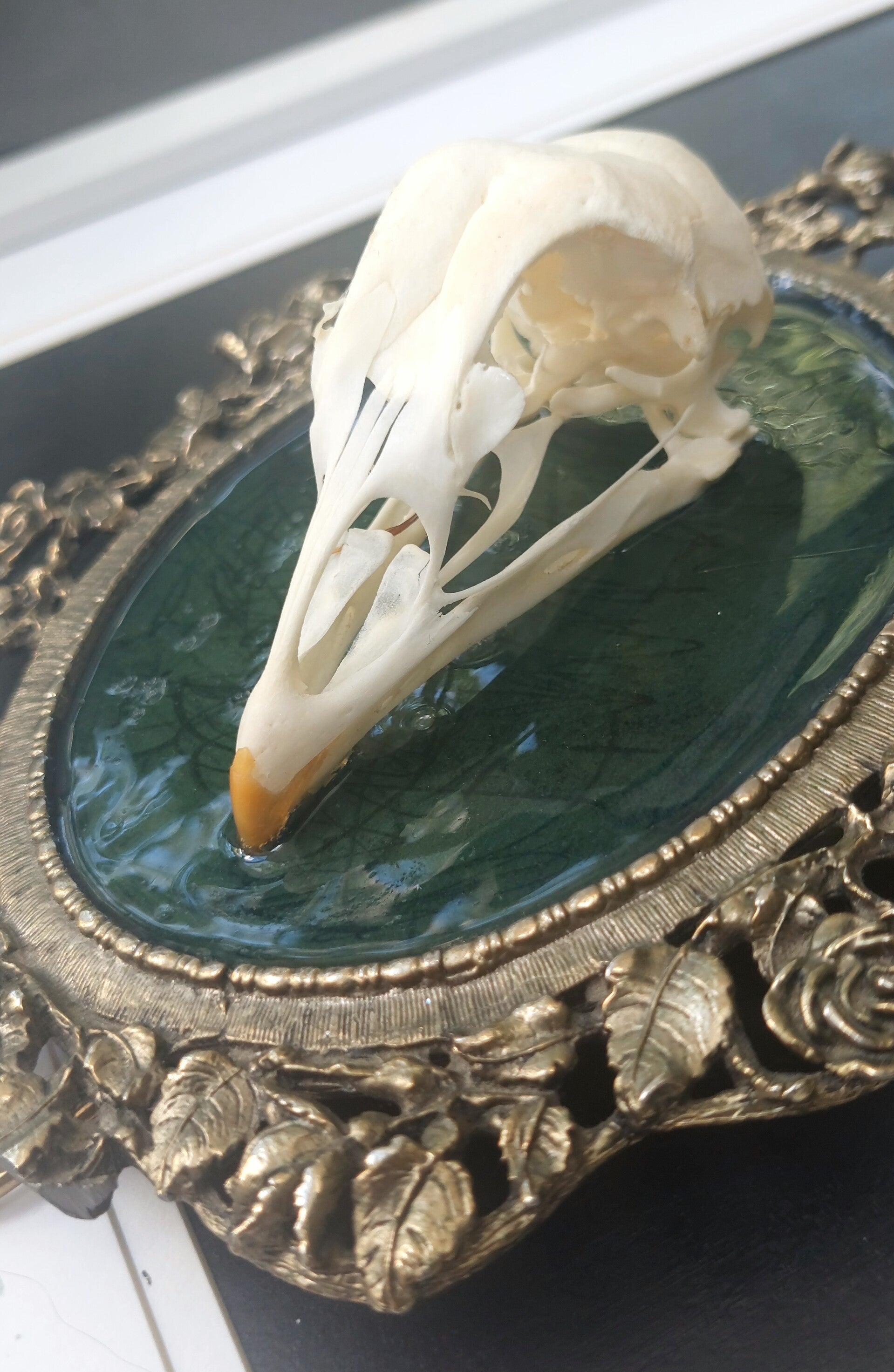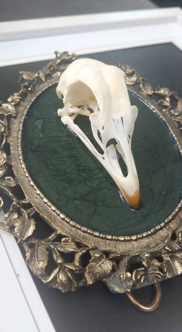 Feral Rooster Skull mounted in vintage frame.