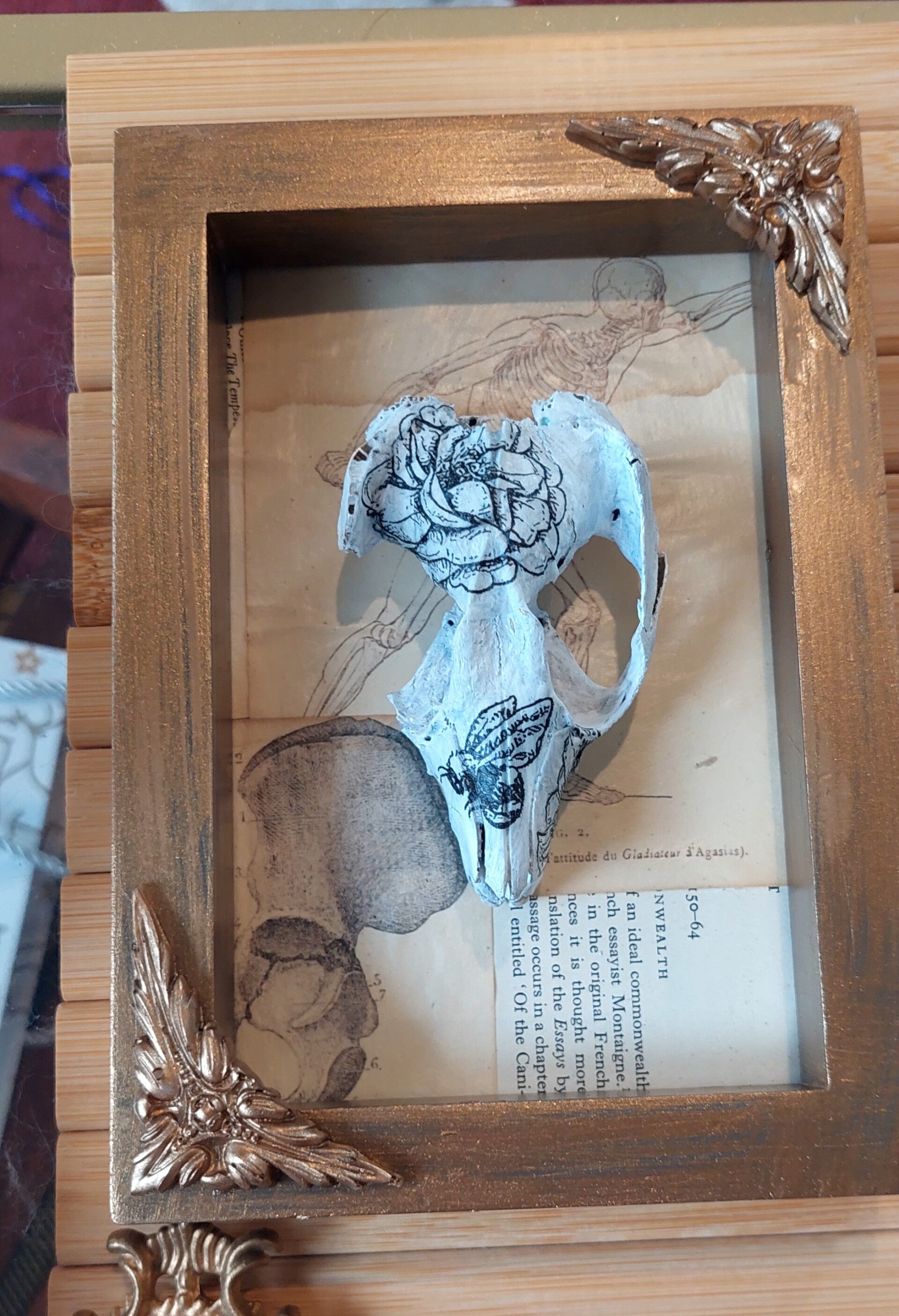 Handcrafted shadow boxes featuring intricate bone art, creating captivating displays that tell a story of the macabre and a balance of the eco-system and the beauty of the dead.